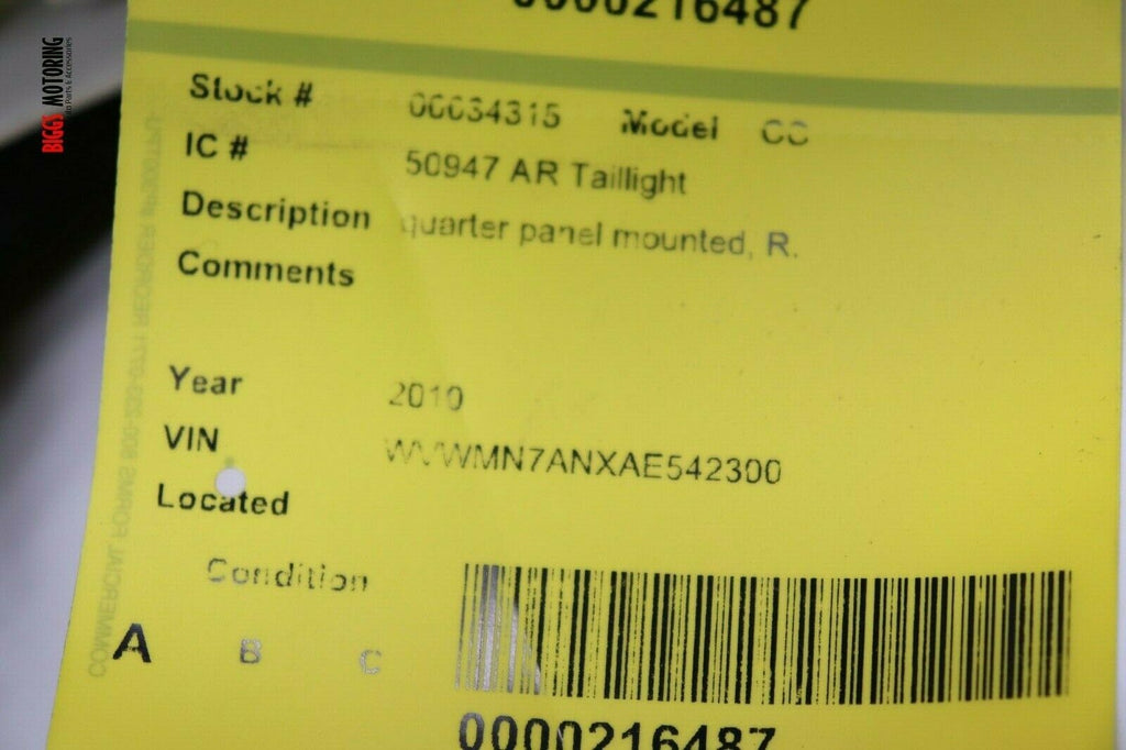 2009-2012 Volkswagen CC Passenger Right Side Rear Tail Light 34315