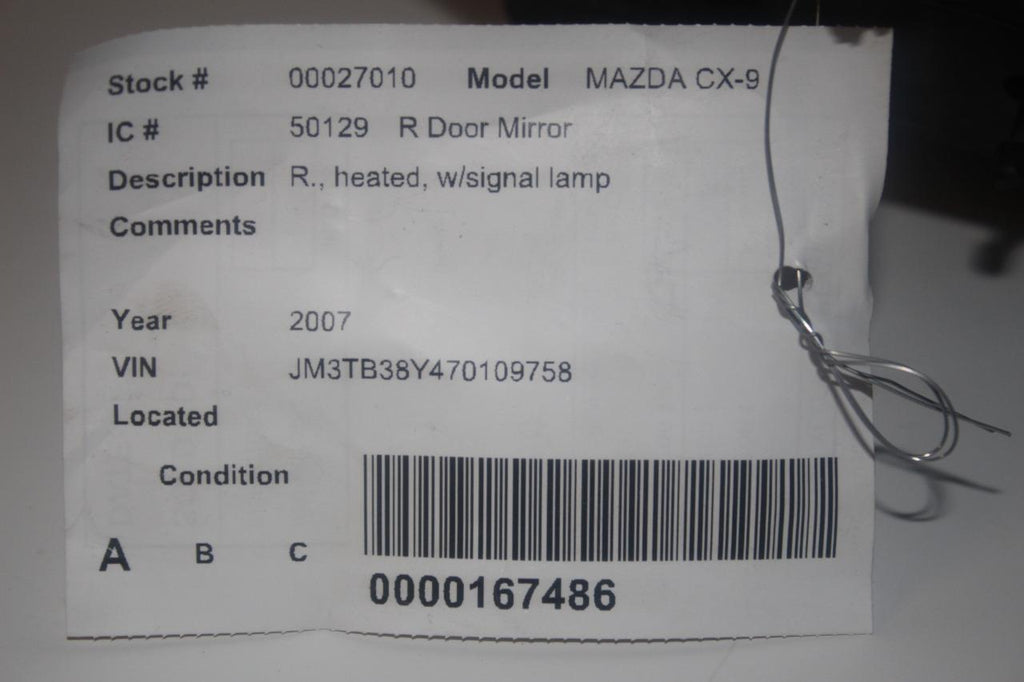 2007-2009 MAZDA CX-9 PASSENGER RIGHT SIDE POWER DOOR MIRROR BLACK